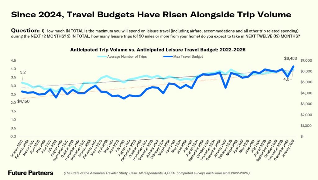 Though recession fears continue to cool for a third consecutive month, American travelers remain cautious about their financial future as 2026 unfolds. One-third reported feeling financially better off than a year ago (a modest rebound both month-over-month and year-over-year) while optimism about the year ahead remains meaningfully below early 2025 levels. Despite this financial restraint, commitment to travel remains strong. The share of travelers who say now is a good time to spend on travel has held steady, nearly six in ten rank travel as a high near-term priority, and average anticipated annual leisure travel budgets reached a new record high of $6,453.