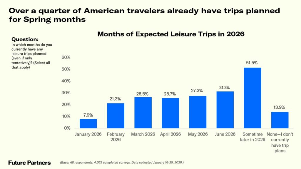 - Future Partners also asked a set of questions around recent travel behaviors and preferences this month, to dig deeper into how Americans are traveling as we enter 2026. Travelers were asked to rate how well the statement “I have generally stayed in one place rather than hopping between many” in the past year. More than half (52.7%) of American travelers said that this describes them well. Gen Z travelers (67.2%). were the most likely to align with this practice of dedicating their trip to a single destination. In a similar vein, respondents were asked to share how closely the statement “I’ve tried to immerse myself in local culture, nature, and daily life” on their travels in the past year, which just over half (50.9%) said describes them well. There was a much more striking divide across the generational cohorts for this preference for local immersion on trips, with 66.2 percent of Gen Z and 59.1 percent of Millennials aligning with this statement, compared to just 43.5 percent of Baby Boomers. We see similar results when we asked American travelers how often they have gone out of their way to explore lesser-known places on their trips in the past two years; over four in ten Gen Z (40.9%) and nearly one-third of Millennials (32.3%) said they have done so on all or many of their trips, while less than a quarter of Baby Boomers (24.3%) said the same.